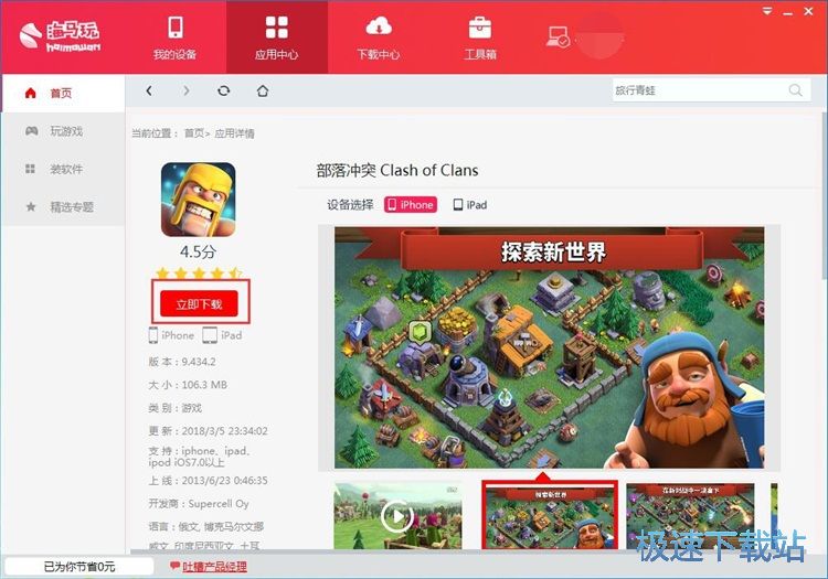 在游戏详情页,我们可以看到部落冲突的评分、支持设备、应用版本、大小、类型和更新日期。点击[立即下载]就可以下载部落冲突安装到手机上;