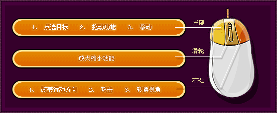 玩家通过鼠标进行移动,点选目标,确定,转换视角和攻击等操作。键位安排如下: