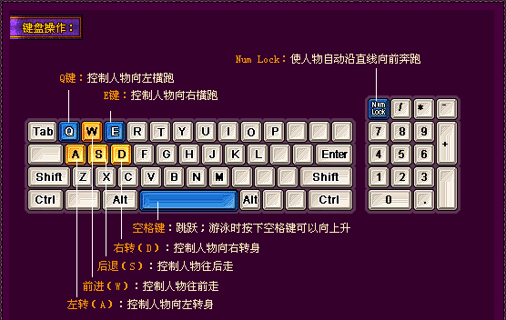 NumLock键:游戏过程中点击NumLock键,角色可自动向前奔跑,再次点击该键或进行其它操作则会打断自动奔跑。
