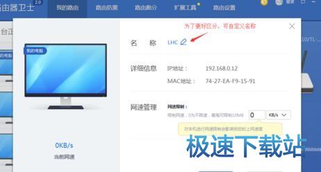 进入后,会看到该电脑的大概信息,如计算机名称、IP、MAC地址。点击名称可自定义修改,在网速管理里可以限制该电脑的最大网速。修改后点击确认生效。