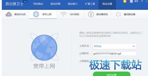 “扩展工具”仅限360安全路由使用,在此就不介绍了。点击“路由设置”可设置宽带上网的帐号、WIFI密码、路由器密码以及重启路由器。
