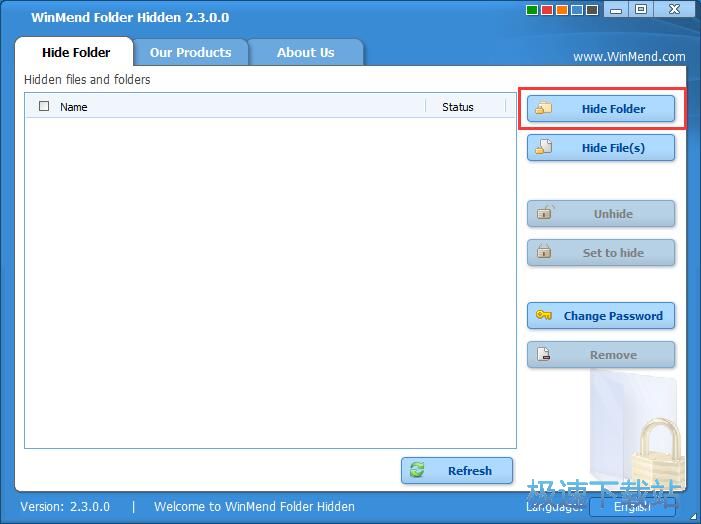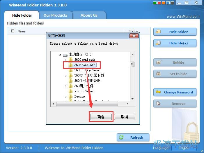 极速小编这一次给大家演示一下怎么使用WinMend Folder Hidden添加文件夹进行隐藏保护。点击WinMend Folder Hidden右上角的Hide Folder,打开文件夹选择窗口;