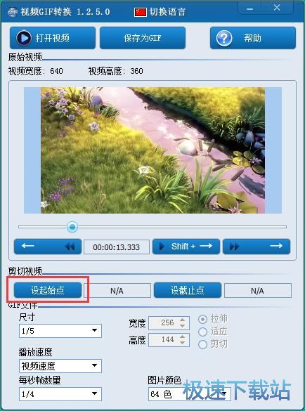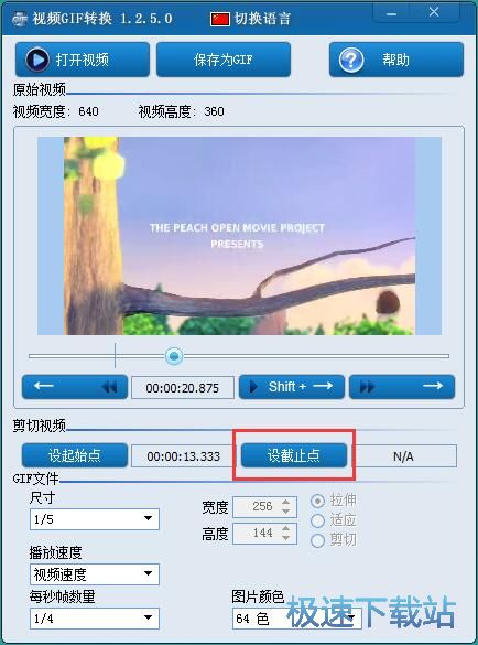接下来我们等待视频进度条播放到剪切视频停止的位置。点击视频GIF转换主界面的设截止点,就可以设置视频剪切的截止点;