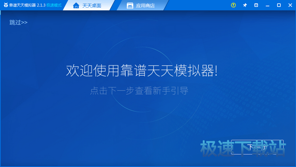 启动成功,欢迎使用靠谱天天模拟器,点击下一步查看新手引导,小编选择了点击左上方的“跳过”;