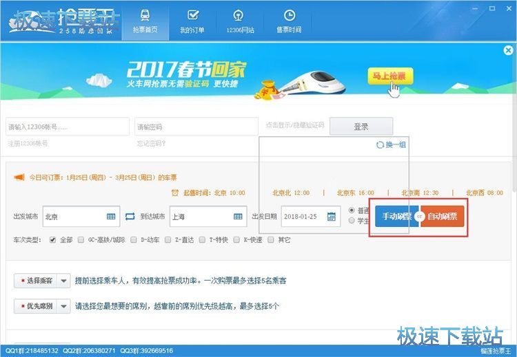 接下来就是开始抢票了,我们可以选择手动刷票或者自动刷票,非常方便。希望各位可以尽早买到自己回家的车票。