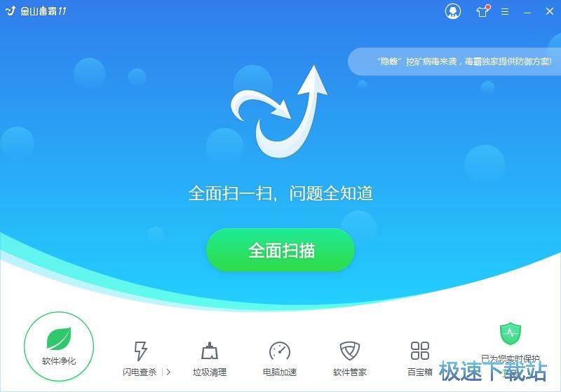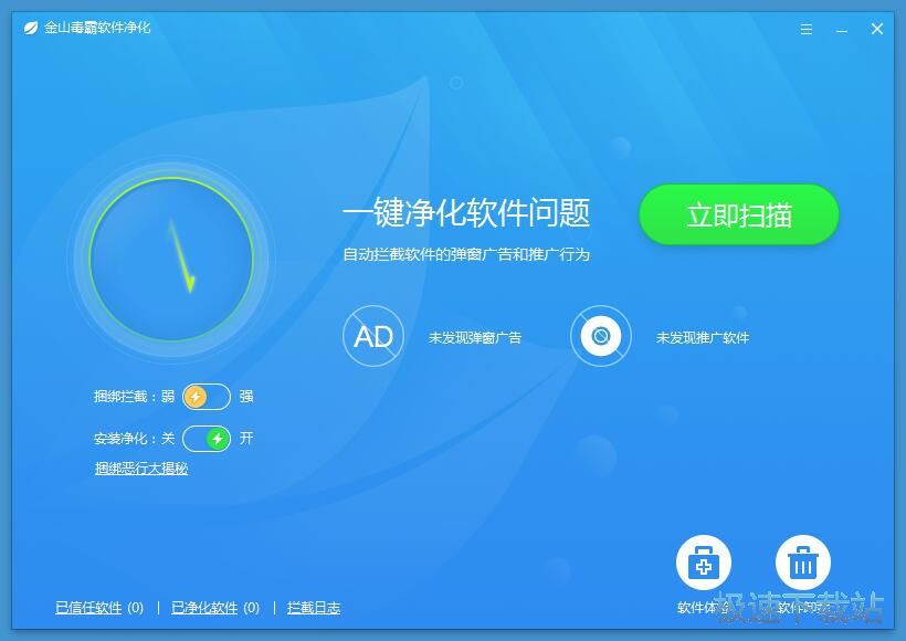 金山毒霸软件净化,一键净化软件问题,自动拦截软件的弹窗广告和推广行为。点击立即扫描就可以开始进行软件净化扫描;
