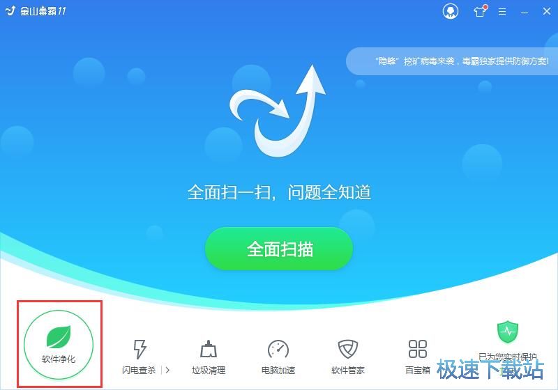 极速小编这一次就给大家演示一下怎么使用金山毒霸对电脑中的软件进行净化。点击金山毒霸主界面中的软件净化,打开金山毒霸软件净化功能;