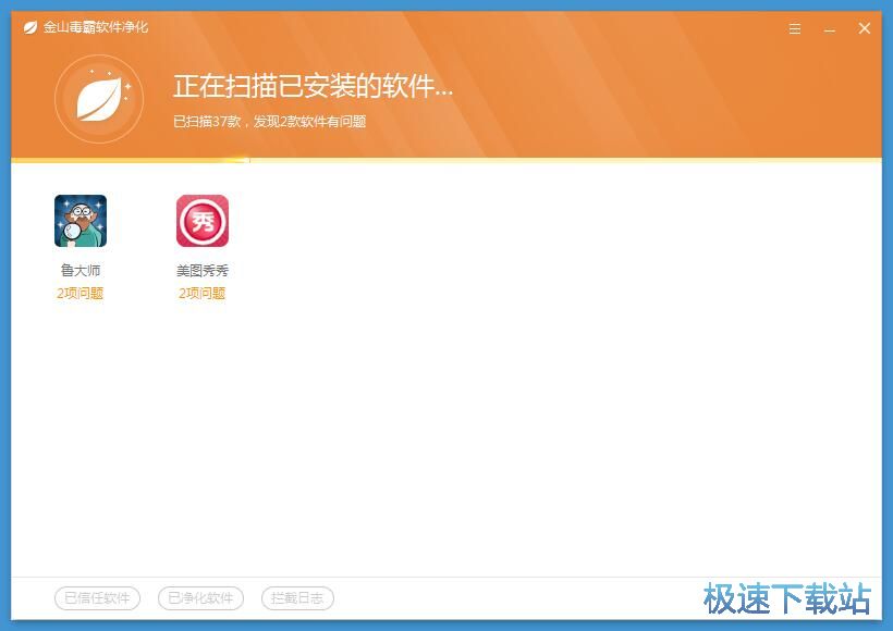金山毒霸正在进行软件净化扫描。目前已经扫描了37款软件,发现其中的2款软件有问题。软件净化扫描需要一定的时间,请耐心等待;
