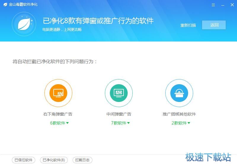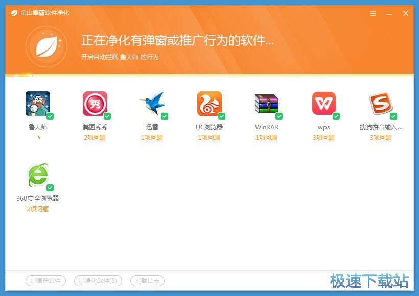 软件净化完成,金山毒霸共净化了8款有弹窗或推广行为的软件。