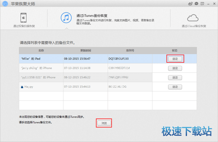 第二步:选择想要恢复的备份文件,点击选定。若未出现设备信息,可点击下方的浏览手动选择 iTunes 备份文件。