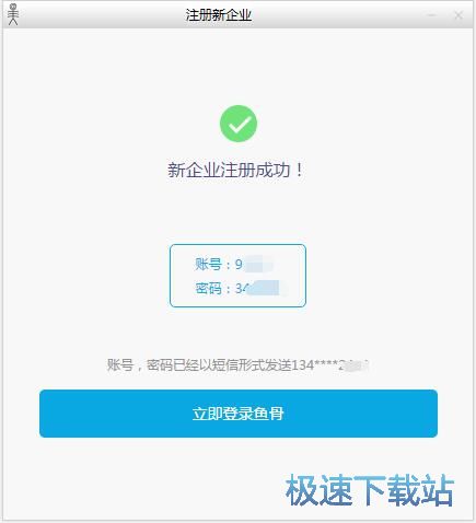 注册成功,这时候鱼骨账号注册页面提示新企业注册成功,还显示账号密码,同时将账号密码发送到注册手机中。点击立即登录鱼骨就可以马上用新账号登录鱼骨开始在线办公了。