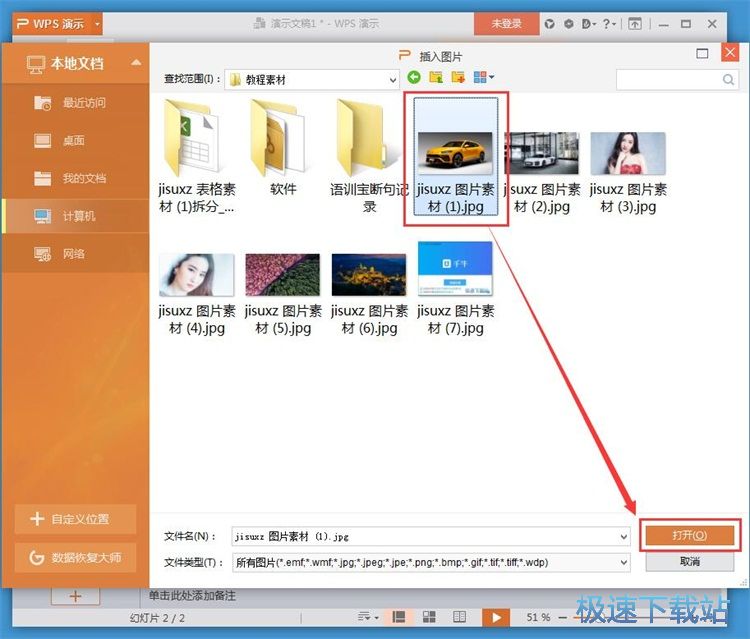 在文件浏览窗口中,根据图片存放的文件路劲找到想要添加到WPP中的图片。鼠标选择好想要添加到WPP中的图片,然后点击打开;
