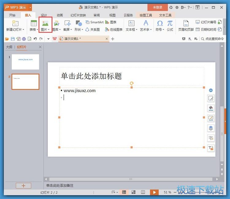 极速小编这一次就给大家演示一下怎么使用WPP来编辑PPT演示文档并将图片插入到WPP演示文稿中。首先我们可以在WPP编辑界面中进行文本编辑。点击WPP主界面顶部功能栏中的图片;