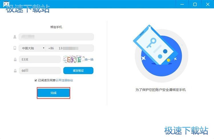 极速小编之前没有使用过云开名师,即使使用了微信登录,仍然需要绑定手机号。输入用户名,电话号码,验证码和短信验证码,勾选同意云开注册协议后点击[完成]就可以完成绑定手机号码操作。绑定手机号码之后账户安全可以得到更好的保障;