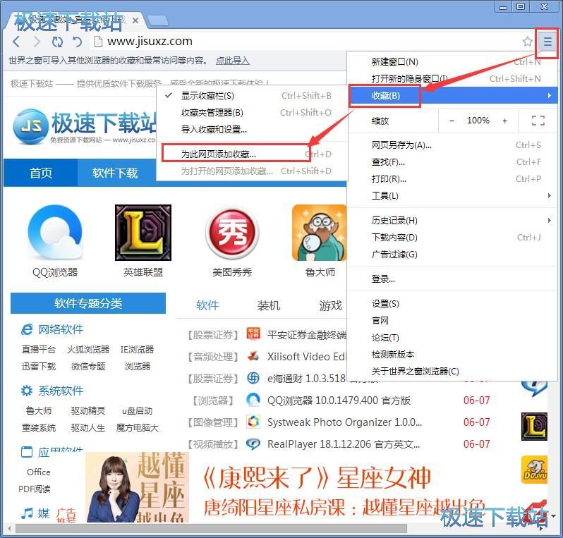 极速小编这一次就给大家演示一下怎么使用世界之窗浏览器添加浏览器网页书签吧。点击世界之窗浏览器主界面右上角的选项按钮,在选项菜单中点击收藏,然后在展开菜单中点击为此网页添加书签;