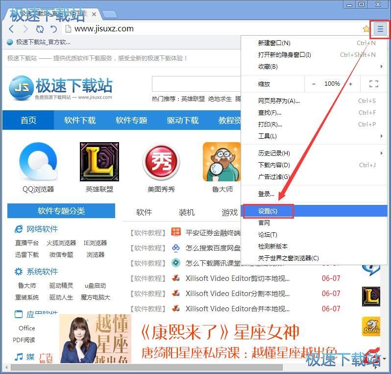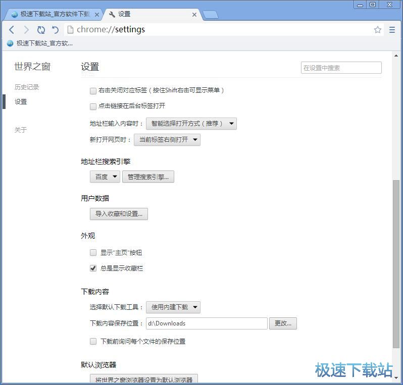接下来我们试一下将电脑中其他的网页浏览器中的书签也导入到世界之窗浏览器中。点击世界之窗浏览器主界面右上角的选项按钮,在选项菜单中点击设置,进入世界之窗浏览器设置界面;