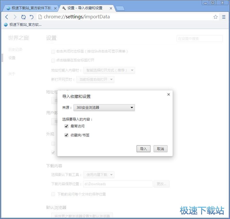 在世界之窗浏览器浏览器设置界面中,我们点击导入收藏和设置。打开浏览器书签导入功能窗口;