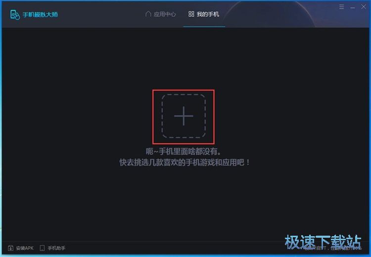 在手机模拟大师的主界面中点击[我的手机],进入手机应用管理页面。极速小编的手机模拟大师还没有安装应用和游戏,赶紧安装一个试用一下。点击界面中的添加符号,进入应用中心添加应用;