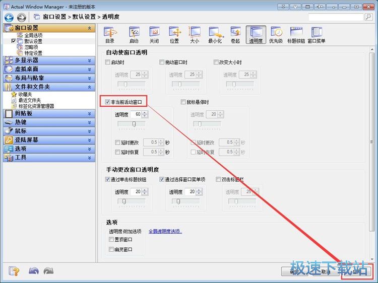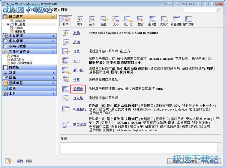 极速小编这一次就给大家演示一下怎么使用Actual Windows Manager设置文件窗口透明和窗口卷起。点击Actual Windows Manager主界面中的透明度,进入Actual Windows Manager透明度设置界面;