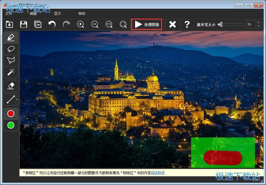 ÕâʱºòͼƬÖгöÏÖÒ»¸öÂÌÉ«µÄ·½¿ò£¬ÊÇTeorex InpaintµÄ²ÎÕÕÇø£¬Teorex Inpaint»á°´ÕÕ²ÎÕÕÇøÀ´´¦ÀíÒÆ³ýÇøÖеÄͼÏñ¡£Ñ¡ÔñºÃ²ÎÕÕÇøºóµã»÷[´¦ÀíͼÏñ]£¬Teorex Inpaint¾Í»á½«Í¼Æ¬ÖÐÑ¡ÖеÄˮӡȥ³ý£»