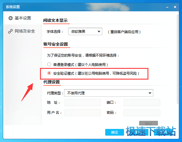 5、在打开的“系统设置”窗口中,将“账号安全设置”修改成“安全验证模式”,再点击“确定”;