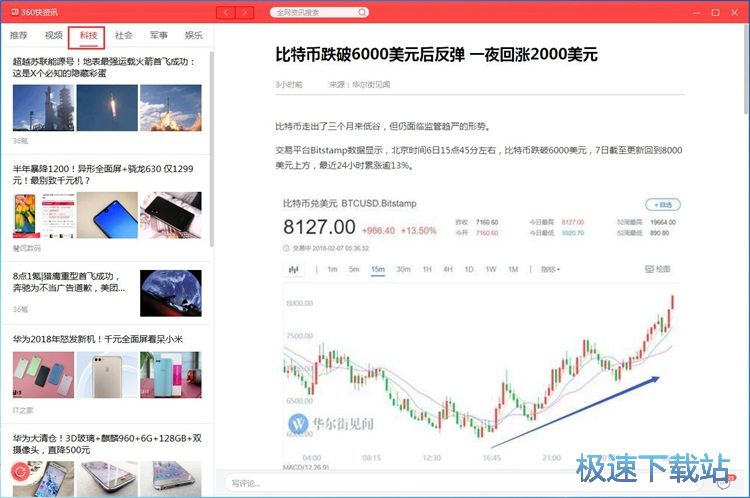 在360快资讯的主界面左边分类栏中点击[科技],进入360快资讯科技频道。在可以频道我们可以看到最新的科技资讯、数码产品测评等文章;
