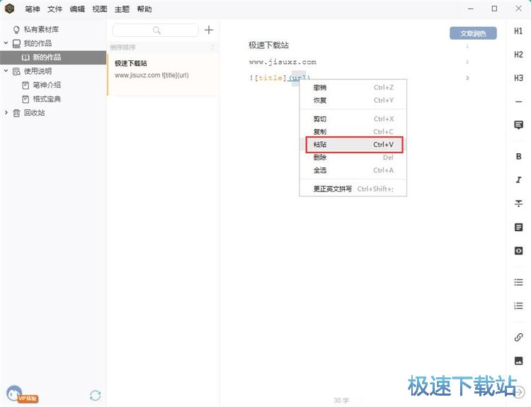 回到笔神的文章编辑界面中,鼠标右键点击文章编辑区域,选择右键菜单中的粘贴,就可以将图片链接粘贴到笔神的文章编辑区域中;