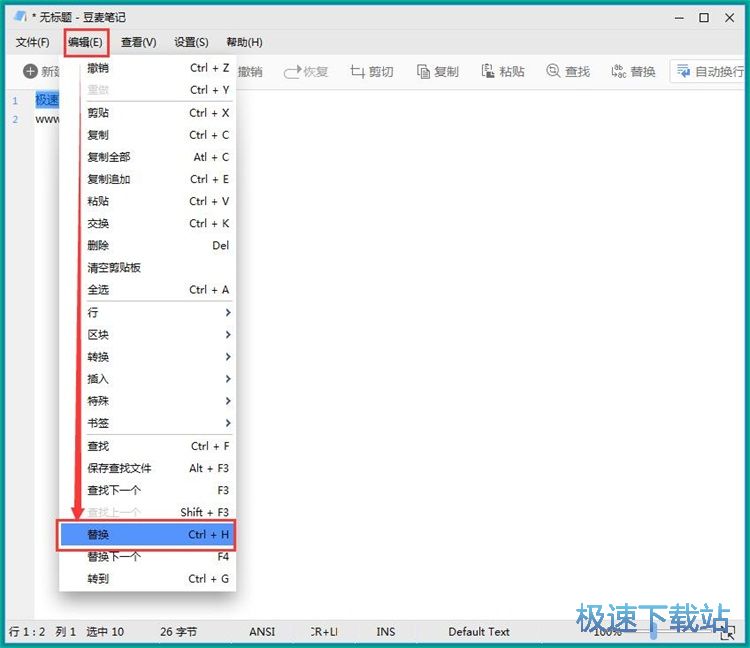 点击豆麦笔记主界面顶部菜单栏中的编辑,在展开的编辑菜单中,点击选中替换,就可以打开豆麦笔记的文本替换功能,我们也可以选择使用键盘的快捷键Ctrl+H,打开文本替换功能窗口;