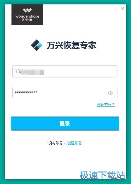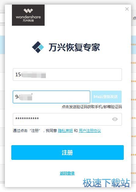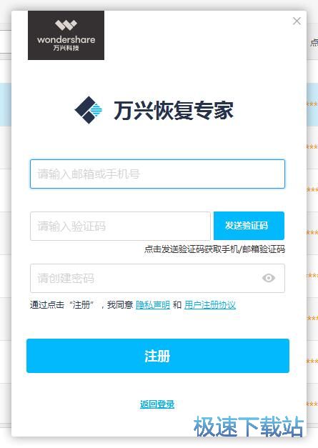 打开万兴苹果恢复专家账号注册界面。要注册万兴苹果恢复专家账号,我们要输入手机号码、短信验证码、密码这三种账号信息;