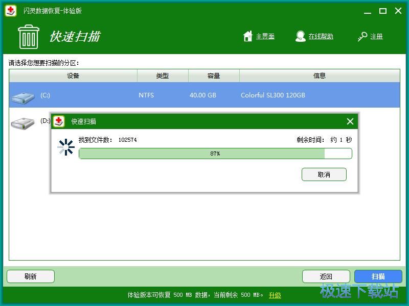 闪灵数据恢复正在扫描电脑C盘中的被删文件。目前闪灵数据恢复已经找到102574个文件,扫描已经完成了87%。软件预计文件扫描剩余时间大约只有1秒;