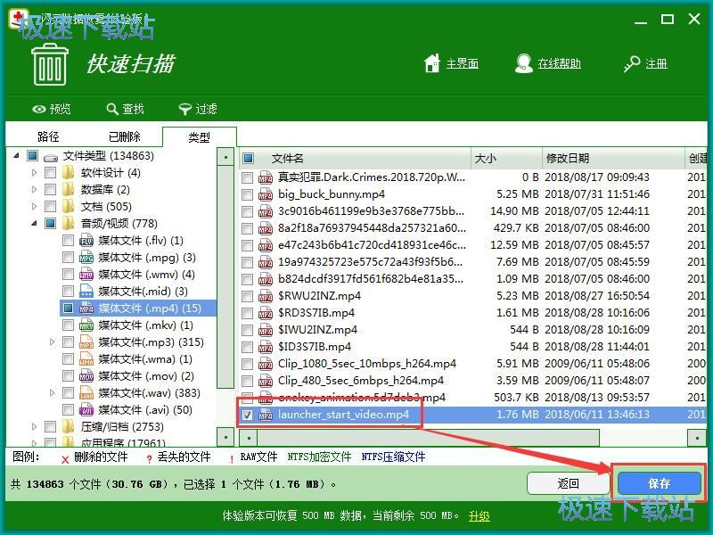 点击选中文件列表中想要进行数据恢复的文件,极速小编选择了一个MP4视频。选中视频后点击恢复,开始将选中的MP4视频文件恢复到电脑中;