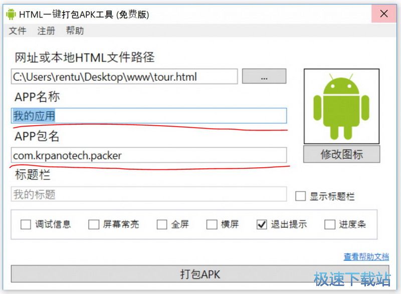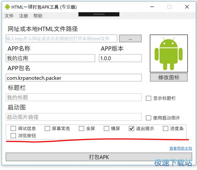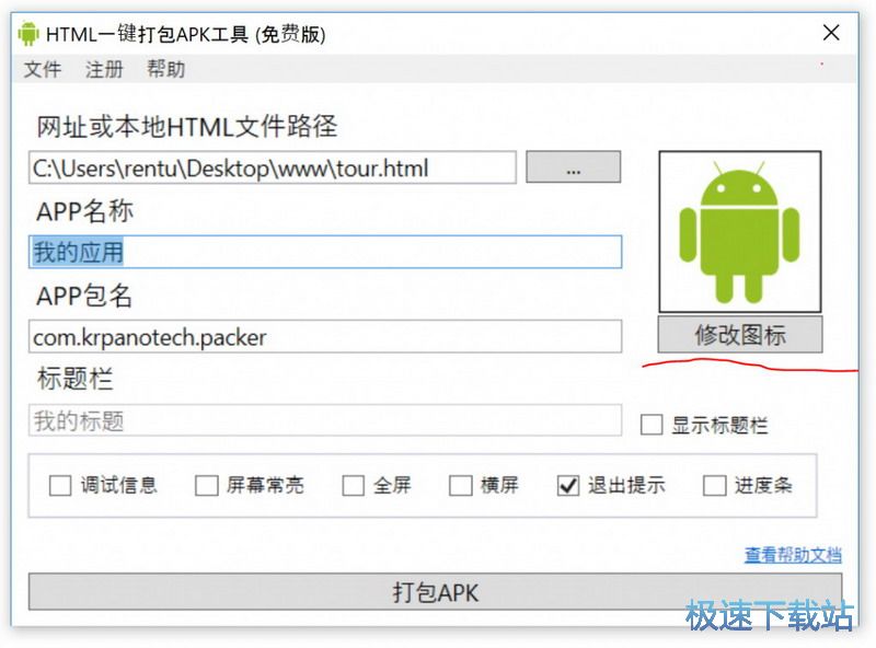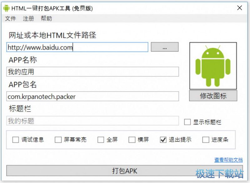 3.支持自定义图标,自定义APP名称,自定义包名,全屏,横屏,退出提示,保持常亮等选项
