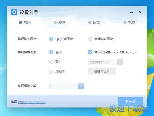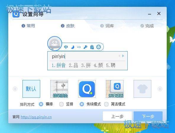 QQ拼音输入法为各位提供了多种输入法皮肤,极速小编就比较懒,直接选择默认皮肤,点击下一步进入词库设置;