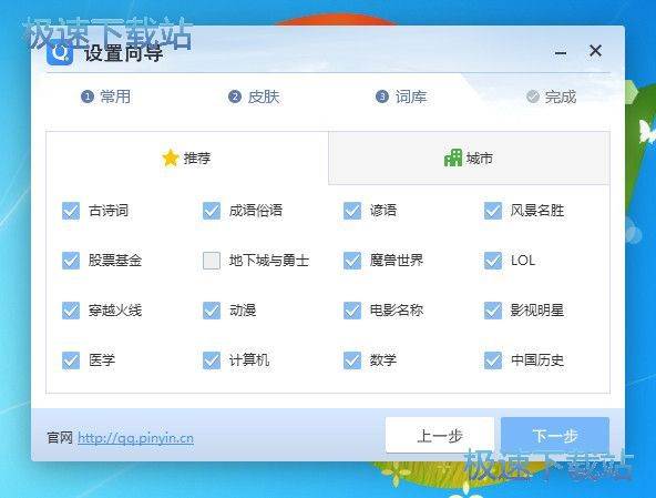 QQ拼音输入法提供了海量的词库,涵盖生活、学习、娱乐等各种领域,勾选自己喜欢的词库类型,就可以完成设置了,QQ拼音输入法还有城市词库功能,选择自己所在的城市,当你输入城市方言、城市名胜景点的时候,QQ拼音输入法就会为你智能选择候选项非常好用,设置好了点击下一步我们就完成设置向导了;