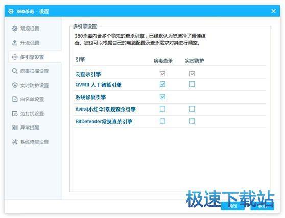 360杀毒具有自动升级功能,如果您开启了自动升级功能,360杀毒会在有升级可用时自动下载并安装升级文件。360杀毒4.0版本默认不安装本地引擎病毒库,如果您想使用本地引擎,请点击主界面右上角的"设置",打开设置界面后点"多引擎设置",然后勾选上常规反病毒引擎查杀和防护,您可以根据自己的喜好选择Bitdifender或Avira常规查杀引擎,选择好了之后点确定按钮: