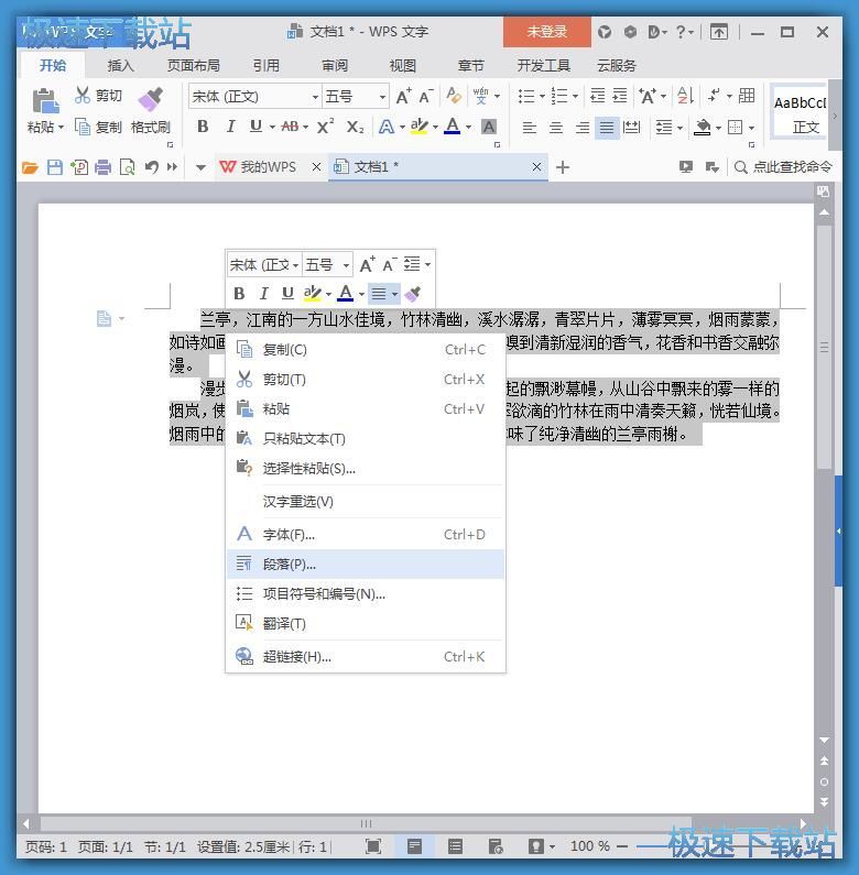 选中编辑好的文段,鼠标右键点击文段,在右键菜单中点击段落,打开WPS段落设置界面;
