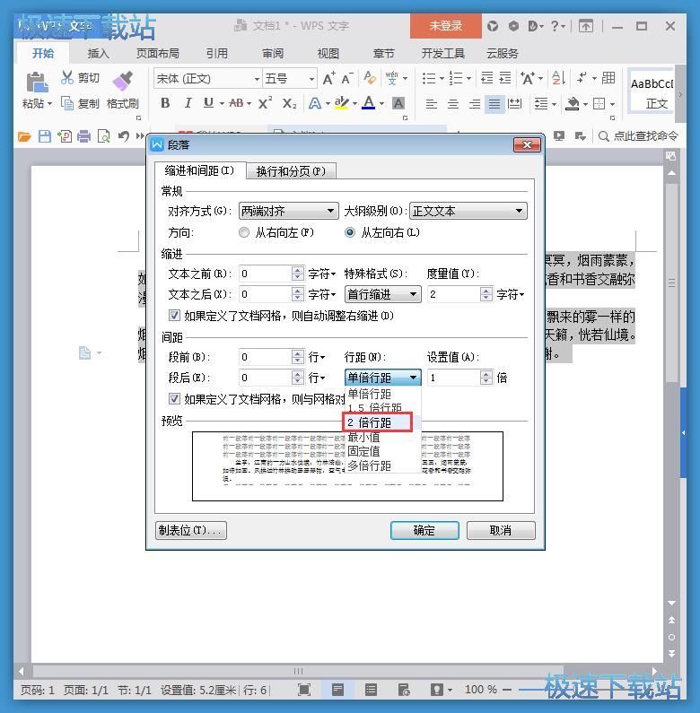 我们在WPS段落设置界面中,点击间距设置中的行距。在展开选项中点击选择2倍行距,将WPS的文段设置成2倍行距;