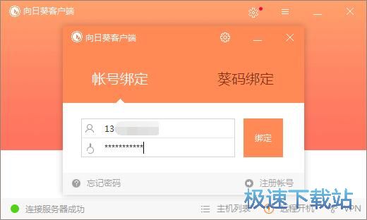 向日葵被控端需要登录向日葵账号才能使用。点击向日葵被控端界面中的[绑定账号]进入账号登录绑定界面。在绑定界面中,输入账号和密码,点击[绑定]就可以登录向日葵账号了。还没有账号的朋友点击[注册账号]就可以注册向日葵账号;