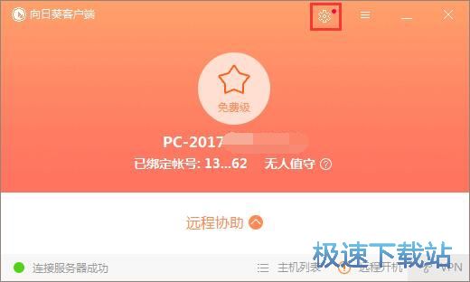 登陆成功,极速小编账号的账户是免费级账号。我们看看免费级账号可以进行什么操作。点击向日葵被控端界面右上方的设置按钮,进入设置页面;