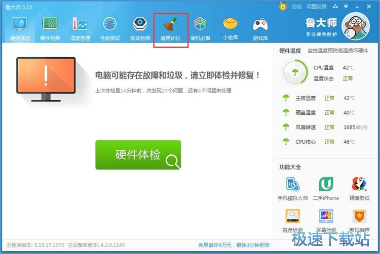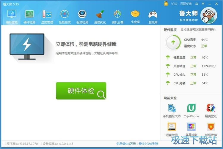 新买的电脑用起来怎么觉得有点卡卡的感觉?不会被电脑城的商家骗了吧?今天极速小编给大家推荐一款电脑监控神器:鲁大师。鲁大师可以为用户检测电脑硬件情况,识别硬件真伪,还能随时监控电脑的运行情况,为用户优化系统,提高电脑运行速度。