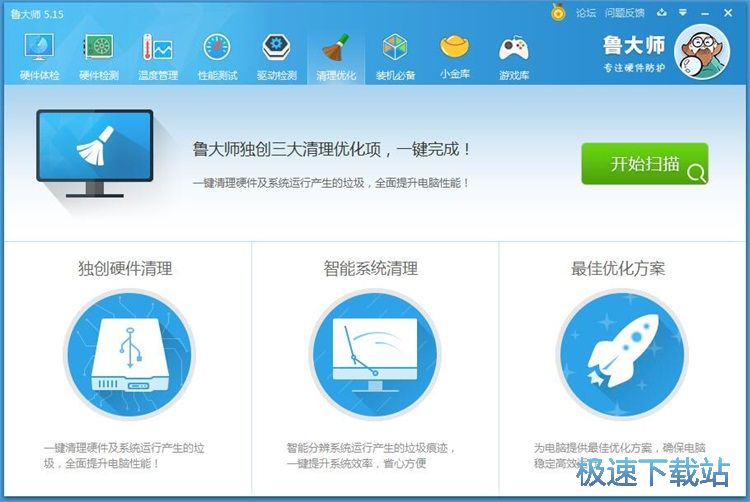 鲁大师独创三大清理优化项,一键完成!一键清理硬件及系统运行产生的垃圾,全面提升电脑性能!一键清理硬件及系统运行产生的垃圾,全面提升电脑性能!智能分辨系统运行产生的垃圾痕迹,一键提升系统效率,省心方便。为电脑提供比较佳优化方案,确保电脑稳定高效运行。点击开始扫描就可以开始进行扫描;