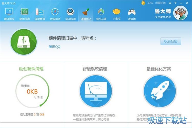 鲁大师正在进行硬件清理扫描。鲁大师还会进行智能系统清理、比较佳优化方案。扫描需要一定时间,请耐心等待;