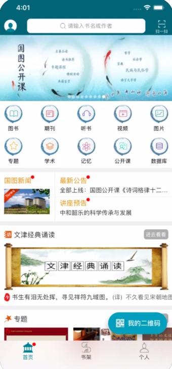 3、信息:发布NLC新闻、公告、会议通知;会议通知提供预约提醒功能;每天九点,推一首文津经典朗诵的名诗词句。