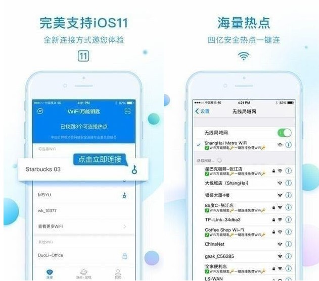 wifi万能钥匙ios版全球最大的网络共享互助平台,基于分享经济模式,帮助用户自动查询周边开放免费公共WiFi热点信息,一键连接可免费上网,是苹果手机必备的免费上网工具。