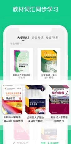 1.教材词汇同步学习:分册、分单元收录外教社大学英语教材主干教程中的生词,帮助用户与课堂教学同步学习。