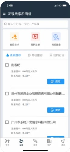 提取后,线索就会从系统的“找线索”进入“线索管理”,到这里我们就完成了找客户的工作。如果是企业用户,系统会有线索保护,一条线索不可多人提取,避免撞单,也可以由管理员统一提取,再进行分配。