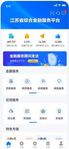 江苏金服是江苏省联合征信有限公司推出的江苏省综合金融服务平台,是向中小零星企业、金融机构、政府部门等展示金融服务、征信服务、惠企政策的综合服务的品台。这款应用程序功能全面,好用实用,操作简单方便。