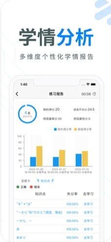 今题日语以颗粒化知识点形成的大题库为基础,以课程标准或考试大纲为依据,通过运用云计算、大数据分析、人工智能等核心技术,集学、练、测、评为一体,如基因检测般,追根溯源、查漏补缺,精准定位薄弱知识点,动态规划学习路径,让语言学习更加精准高效。