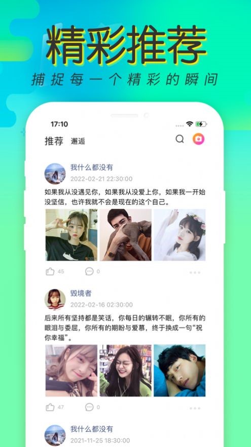 蓝趣交友是一款免费开放结交更多朋友的社交软件。用户使用这款软件能够与其他用户随时交流,找到志同道合的朋友,还可以线下约会见面。使用起来方便,画面清晰,随时都给用户推荐真实可靠的朋友。感兴趣的朋友可以下载试试。