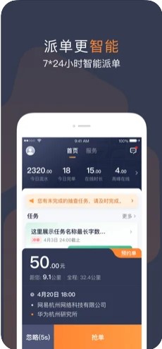 海量订单7*24小时智能派单,不愁没单抢,派单无倾斜,单单都公平。